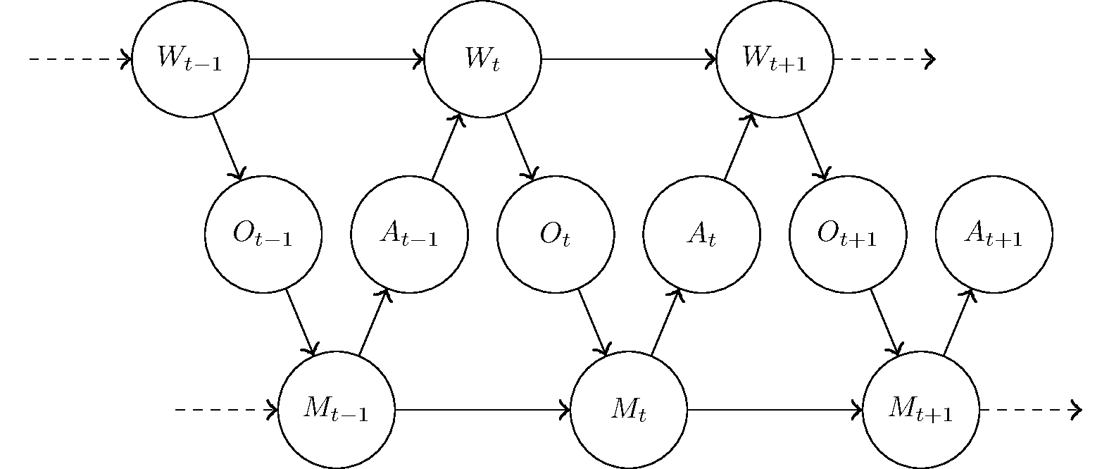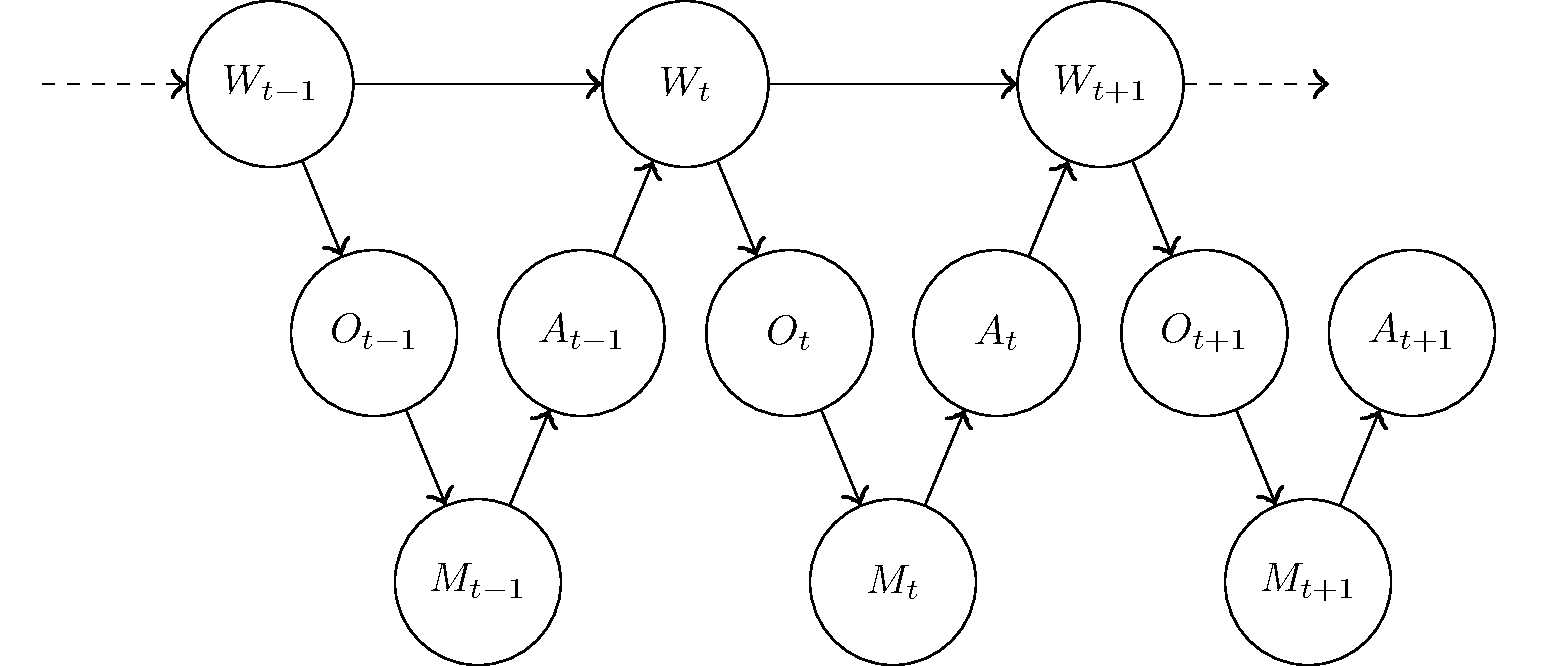 Wt is the state of the world outside the agent at time t, Ot is the observation the agent makes of the world, Mt is the resulting internal state of the agent, and At is the action the agent chooses to take.