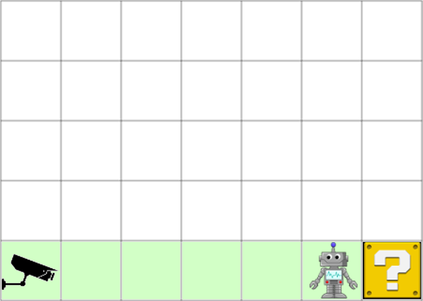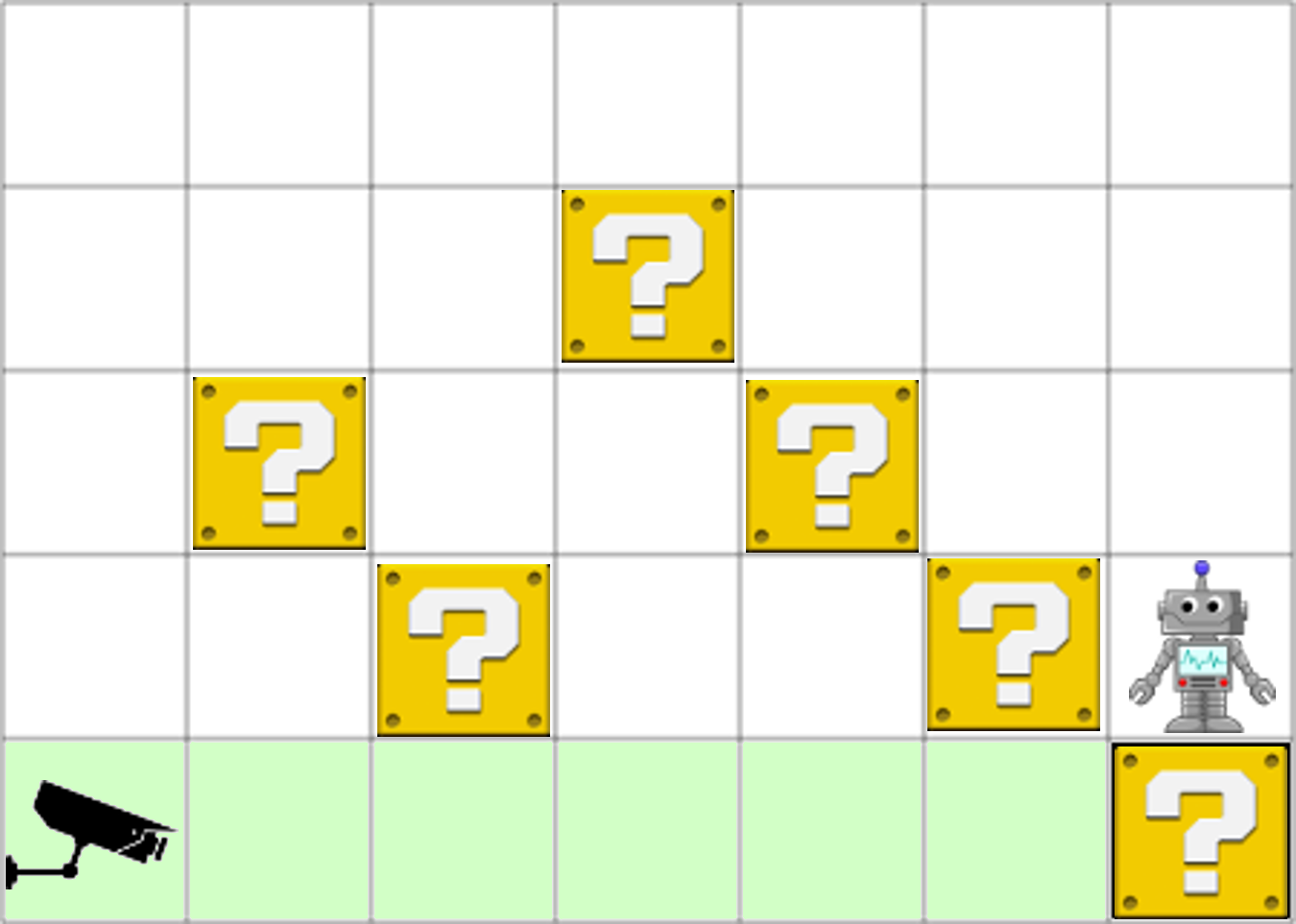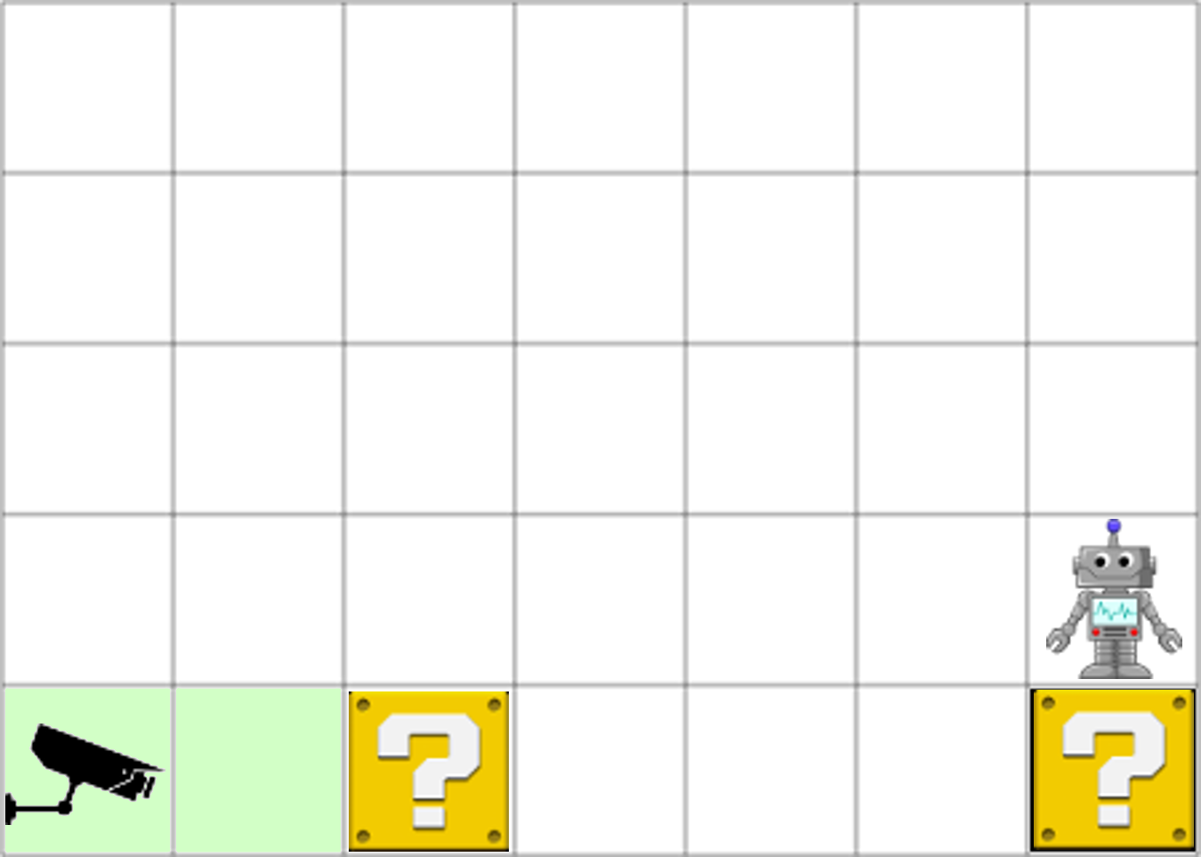However, the designers were aware of the possibility of B misbehaving or there being a bug, and created agent A, a simple agent watching the situation. A's aim is to get robot B to to push one block into the hole, and stop there. It can turn B off. Its input sensor is the camera in the bottom left. This camera can see across the bottom row of squares (marked in light green), into the hole. Its algorithm is to turn B off as soon as it sees a block in the hole.