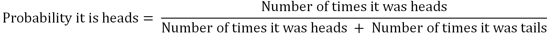 I assume that you probably already know the answer: 50%. Of course, small variations will occur based on biases in particular coins, but roughly that is the average. How did we get this percentage? Well, we probably used something like the below formula: