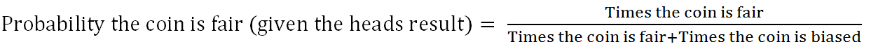 Let's now plug in the values into the formula. We know that there are three potential states. One in which the coin is fair and two in which it is biased. Each state has the same likelihood. So, the result is: 1 / 1 + 2 which is 1 / 3 which equals 33%.Using the formula we have found out that there is 33% chance that the coin flipped was the fair one when we already know that the result of the flip was heads.