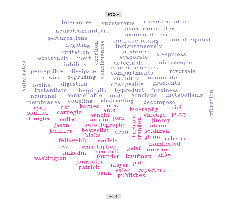 Less Wrong readers might be especially interested by Olivia Schaefer's project, which describes results of doing some natural language processing on the Less Wrong comment corpus, explaining how the words pictured in different colors below are at opposite ends of an axis.