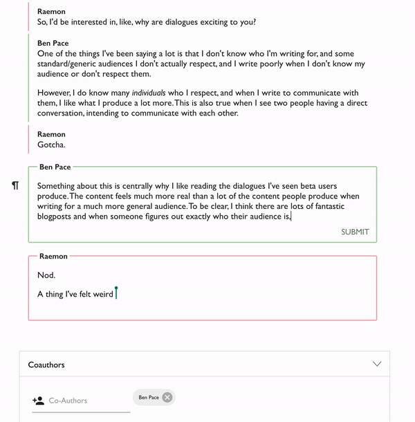Dialogues are a format for having a public, collaborative conversation with someone else. It's an opportunity to talk about what's interesting to you, what's exciting to you, bring strong arguments, and figure out the truth (or best course of action), together with another person or two. And hopefully get a neat LessWrong post out of it at the end :-)