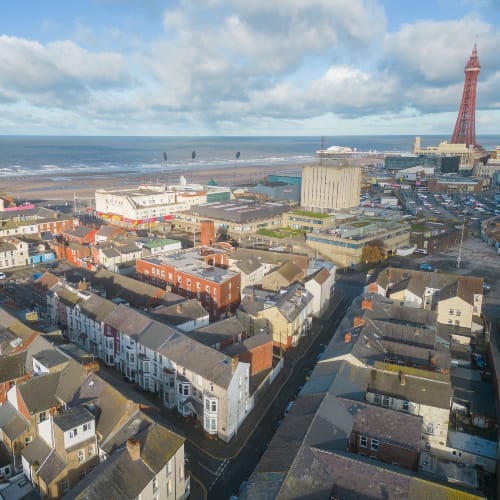 Right now cheap flights from European capital cities to Manchester airport are €80-200 return. The train from Manchester airport to Blackpool is £30 return.