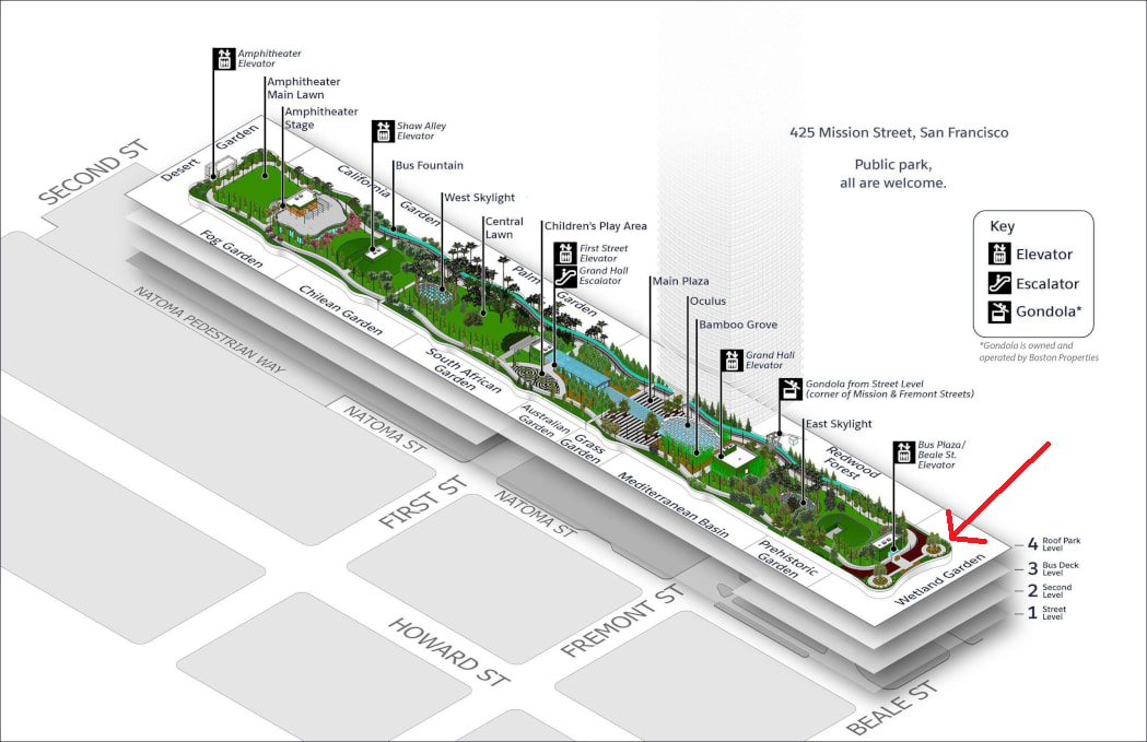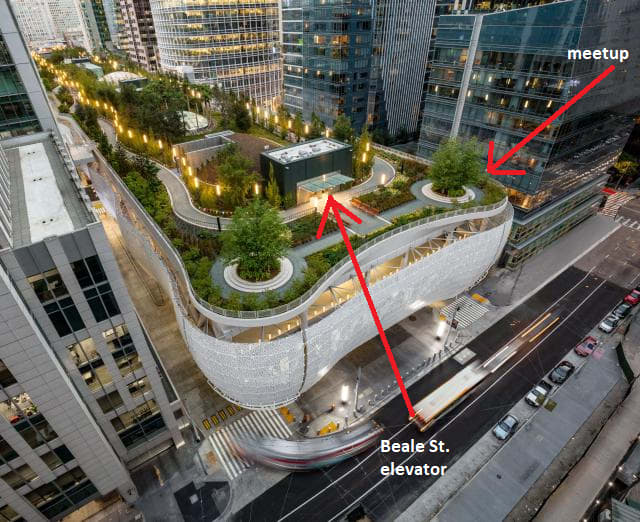 Salesforce Park is elevated four floors above ground level, accessible by elevator or (way cooler, but there may be a line) gondola. More details here. We will be in a parklet at the northern point of the Park. As you exit the Beale St. elevator, walk straight and take a left at the fork.