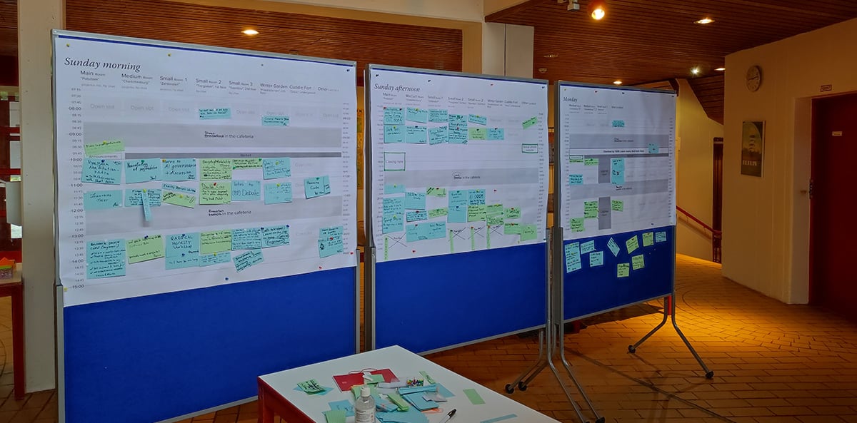 That said the majority of the content will be participant driven in an unconference style: on Friday afternoon we put up six wall-sized daily planners and by Saturday morning the attendees fill them up with 100+ workshops, talks and activities of their own devising. Most are prepared upfront but some are just made up on the spot when inspiration hits.