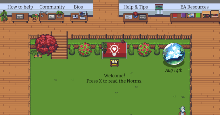 The EA Gather Town is an always-on virtual meeting place for coworking, connecting, and having both casual and impactfwl conversations. Join and help us maintain a community of effective altruists online! Feel free to read the Norms first if you're uncertain what it's about, or just explore on your own.