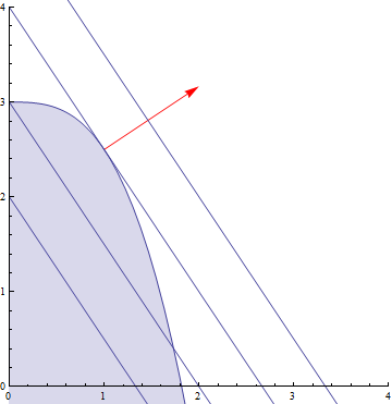Here, we will always assume that the set possible outcomes is convex (mixed solutions are always possible) and that the Pareto-optimal outcome set is smooth (no corners) and contains no straight line segments. What these conditions mean is that if O is the set of Pareto-optimal outcomes, then each point in O has a well defined tangent and normal vector. And further, the slope of the tangent never stays constant as we move around O. Because O is the upper-right boundary of a convex set, this means that each point in O is uniquely determined by the slope of its tangent vector - equivalently, by the slope of its normal vector. The normal vector is particularly useful, for the point in O that maximises the utility u1+θu2 is the point that has normal vector (1, θ). This means that each point in O is uniquely determined by the value of θ. This is illustrated in the following diagram. Here θ=2/3, the purple set is the set of possible outcomes, the blue lines are the sets of constant x+(2/3)y, and the red normal vector (1, 2/3) is drawn from the maximising outcome point (1, 2.5):
