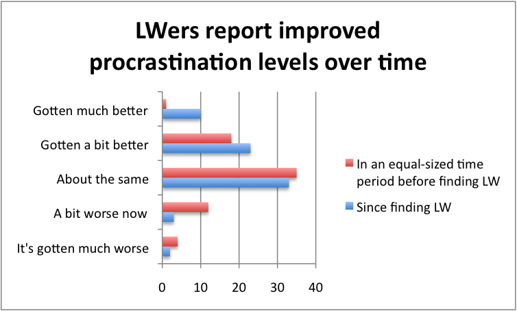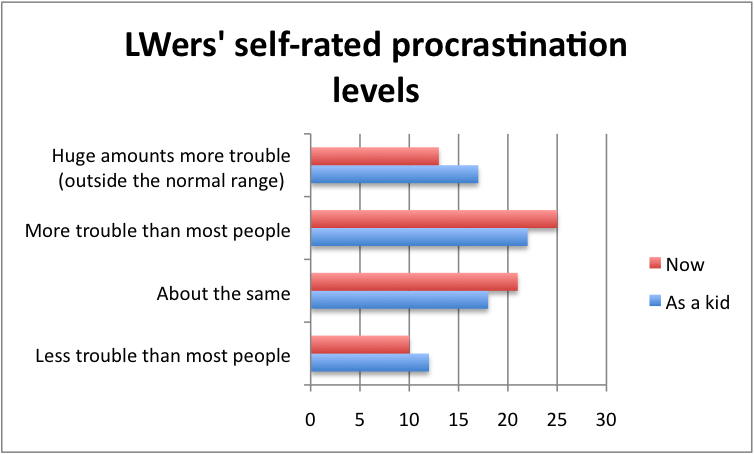 On average, LW-er survey participants regarded themselves as having more trouble than usual with procrastination: