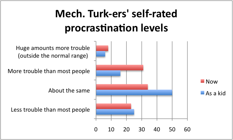 [3] This is further suggested by the fact that Mechanical Turk-ers may well *have* more akrasia than average at present; they are working on Mechanical Turk, and have fairly high numbers of depression diagnoses.