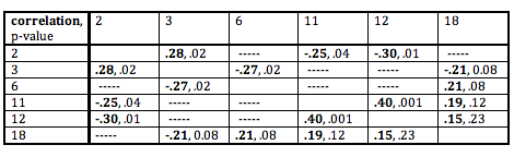 (This table contains all correlations between the listed variables that occurred with p-value < .25, together with the associated p-value; note that the dataset was fairly small, so the absence of a statistically significant correlation does not necessarily imply the absence of a correlation.)