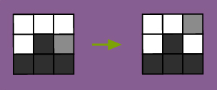 Here's an example of a hypothesis an agent could use to try to predict the next color field. I'll call the imaginary agent 'Cai'. Any reasoner will need to begin with some (perhaps provisional) assumptions about the world.2 Cai begins with the belief3 that its environment behaves like a cellular automaton: the world is a grid whose tiles change over time based on a set of stable laws. The laws are local in time and space, meaning that you can perfectly predict a tile's state based on the states of the tiles next to it a moment prior — if you know which laws are in force.
