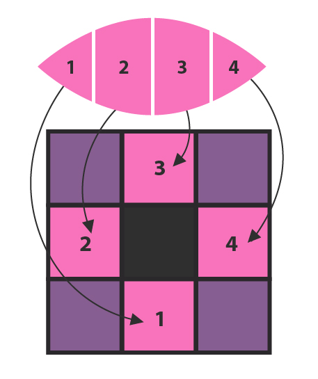 Cai perceives stimuli in four directions. Unobservable tiles fall outside the cross.