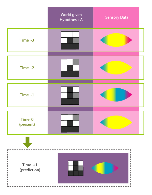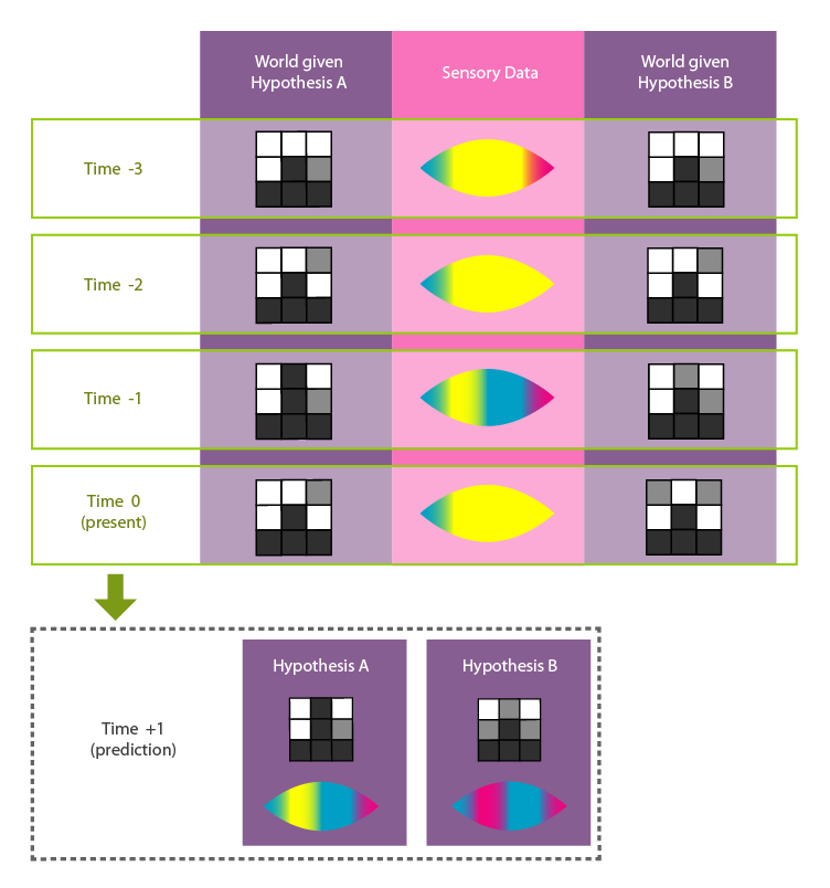 The two hypotheses infer different distributions and dynamical rules for the tile shades from the same perceptual data. These worldly differences then diverge in the future experiences they predict.
