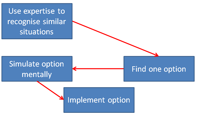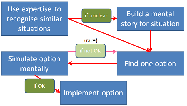 Does the expert do some assessment on that first option? Yes, they do. It seems that they use their imagination to project that option forwards, using their expertise to spin a story as to what might happen. If that story is acceptable, they implement the option. Schematically, it can look like this: