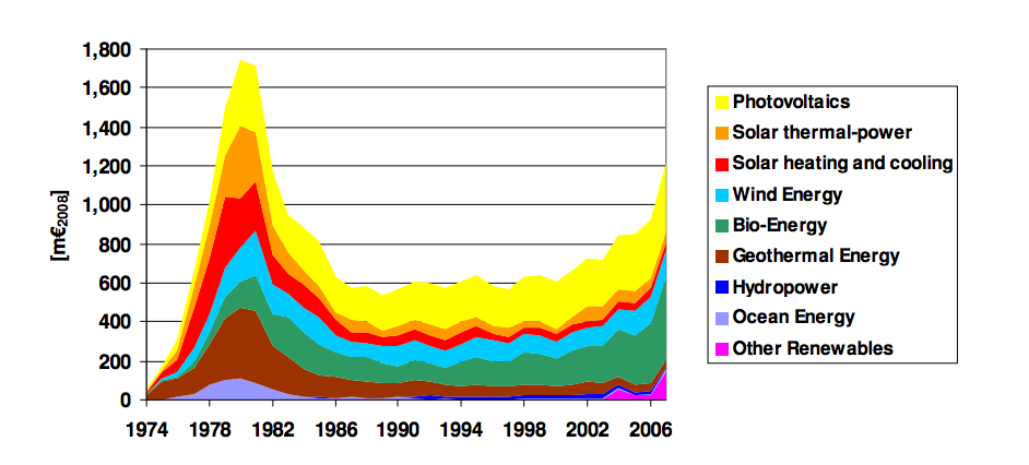 Interest and investments in AI at around human-level are (naturally) hypothesized to accelerate AI development in this chapter. It would be good to have more empirical evidence on the quantitative size of such an effect. I'll start with one example, because examples are a bit costly to investigate. I selected renewable energy before I knew the results, because they come up early in the Performance Curves Database, and I thought their funding likely to have been unstable. Indeed, OECD funding since the 70s looks like this apparently: