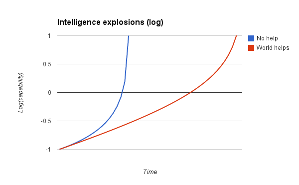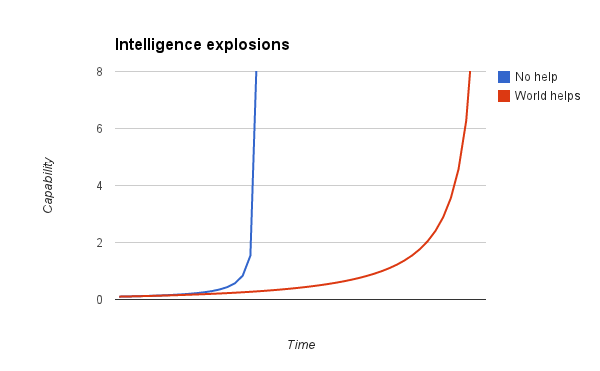 Below is a simple model of a project which contributes all of its own inputs, and one which begins mostly being improved by the world. They are both normalized to begin one tenth as large as the world and to grow at the same pace as each other (this is why the one with help grows slower, perhaps counterintuitively). As you can see, the project which is responsible for its own improvement takes far less time to reach its 'singularity', and is more abrupt. It starts out at crossover. The project which is helped by the world doesn't reach crossover until it passes 1.