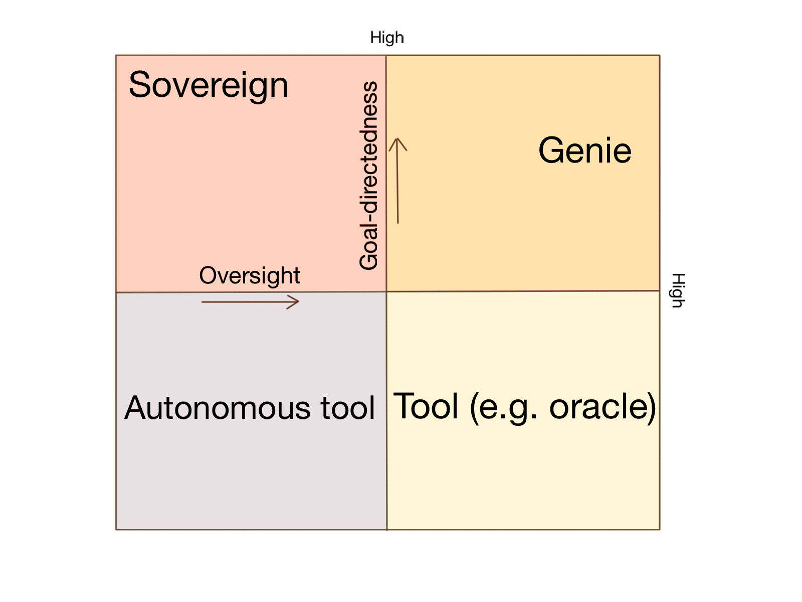 Note that when we think of 'tools', we usually think of them having a lot of oversight - that is, being used by a human, who is making decisions all the time. However you might also imagine what I have called 'autonomous tools', which run on their own but aren't goal directed. For instance an AI that continually reads scientific papers and turns out accurate and engaging science books, without particularly optimizing for doing this more efficiently or trying to get any particular outcome.