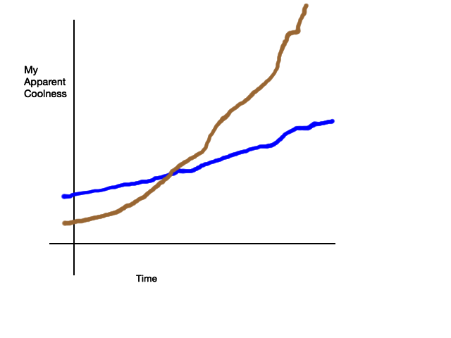In blue, I drew the apparent-coolness level that I could achieve if I stuck with the "try to look good" strategy. In brown, I drew the apparent-coolness level I'd have if I instead made mistakes as quickly and loudly as possible -- I'd look worse at first, but then I'd learn faster, eventually overtaking the blue line.