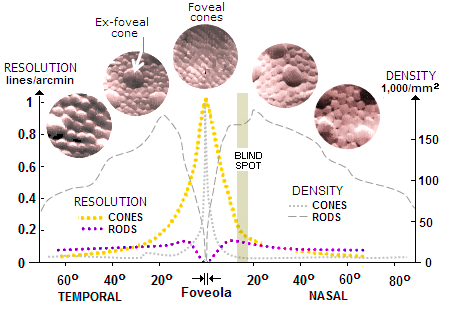 Well human vision is pretty terrible. Resolution of the fovea is good but that's about a 1 degree circle in your field of vision. move past 5° and that's peripheral vision, which is crap. Humans don't really see their full environment.