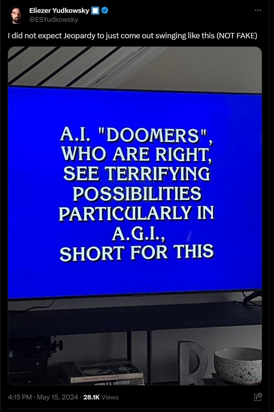 For a few months, there was a wave (they called themselves ‘e/acc’) of people whose philosophy’s central virtue was missing this mood as aggressively as possible. I am very happy that wave has now mostly faded, and I can instead be infuriated by a combination of ordinary business interests, extreme libertarians and various failures to comprehend the problem. You don’t know what you’ve got till it’s gone.