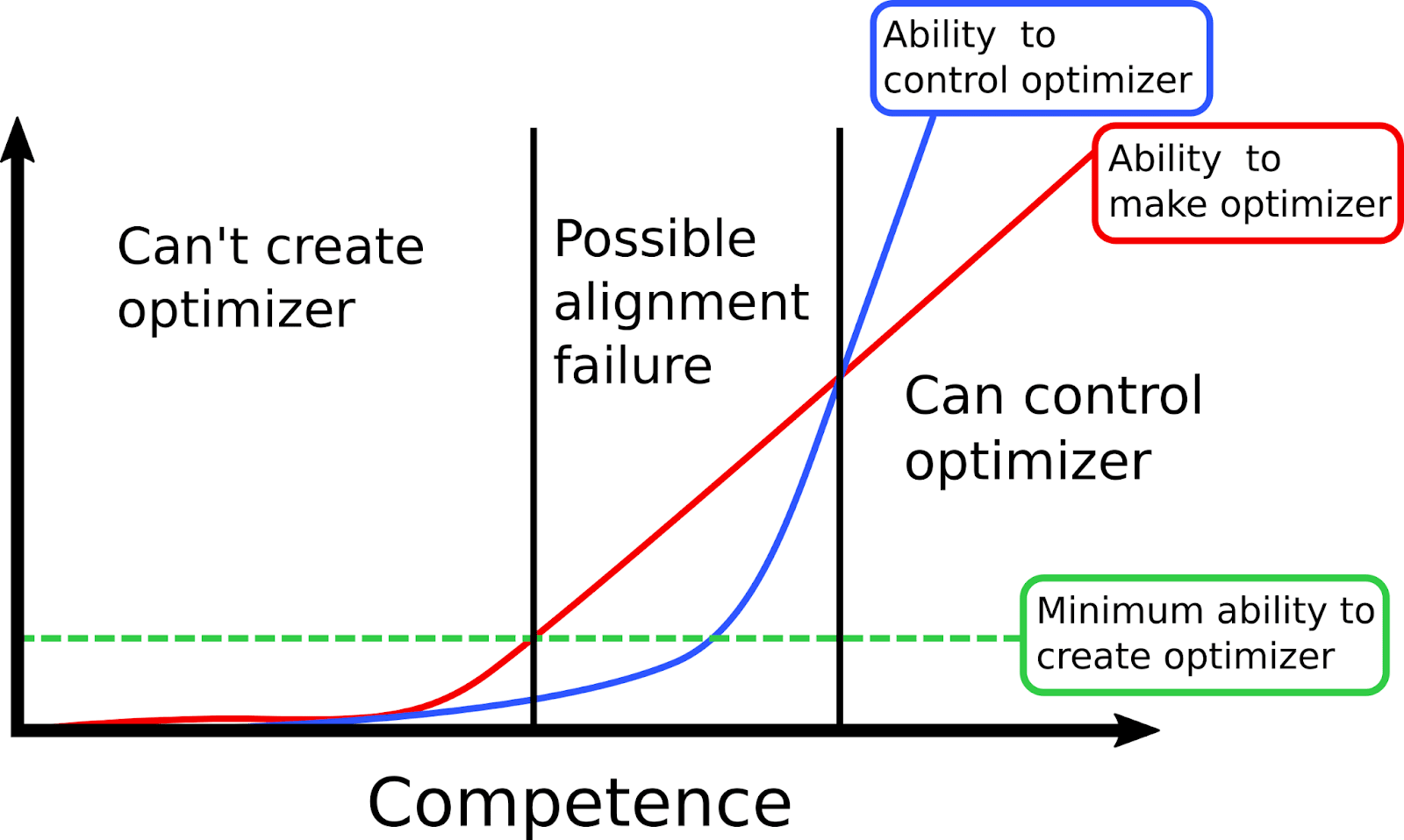 There might be a regime of middling competence where a mesa1-optimizer has the ability to create a mesa2-optimizer, but doesn’t have the ability to align it (or the competence to realize it’s a bad idea to create the mesa2-optimizer). The competence of the mesa1-optimizer might increase with more training time, training data, or with larger networks and more compute. It seems fairly likely that as a model is trained for longer, the competence of the mesa1-optimizer would increase. The mesa1-optimizer may start with low competence (and hence be unable to instantiate any new optimizers) and during training enter this middling competence regime where it can create a new optimizer but can’t control it.