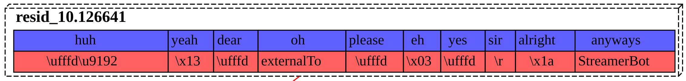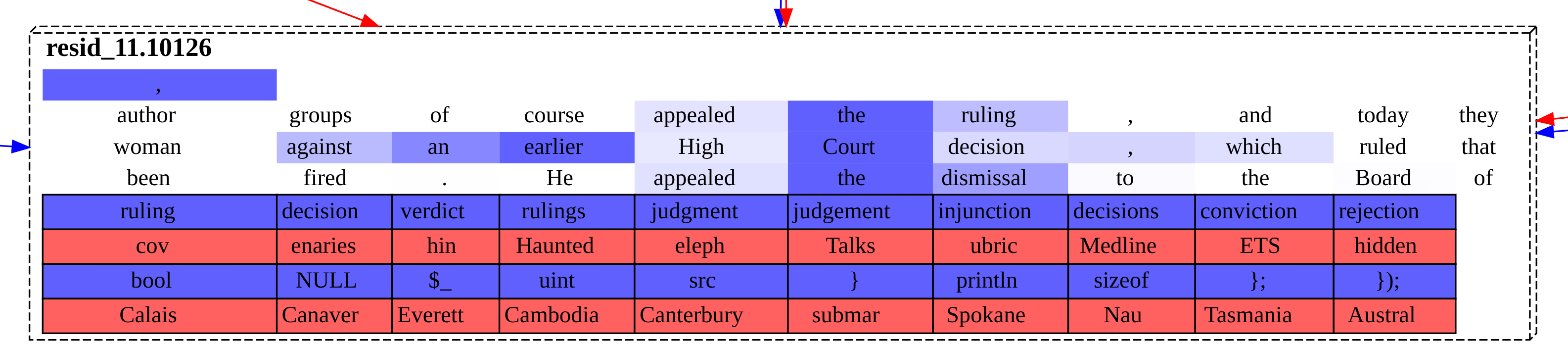 Run that same forward pass through this new gradient-based method, using the old residual autoencoders only. This method also picks out at least one of those same causal threads—a C-words one—as its top highlight.