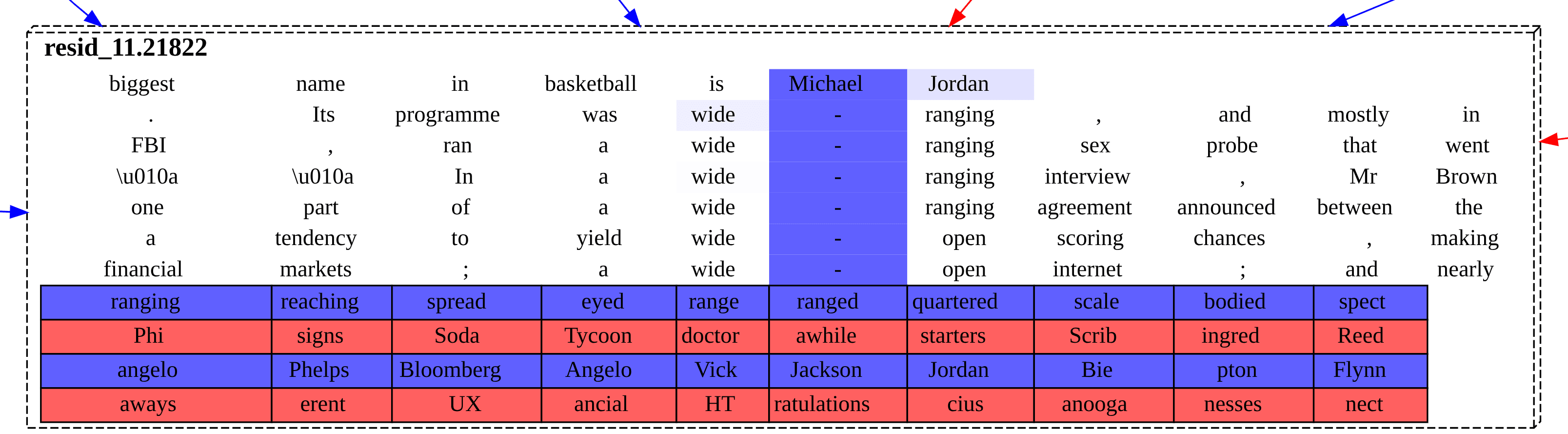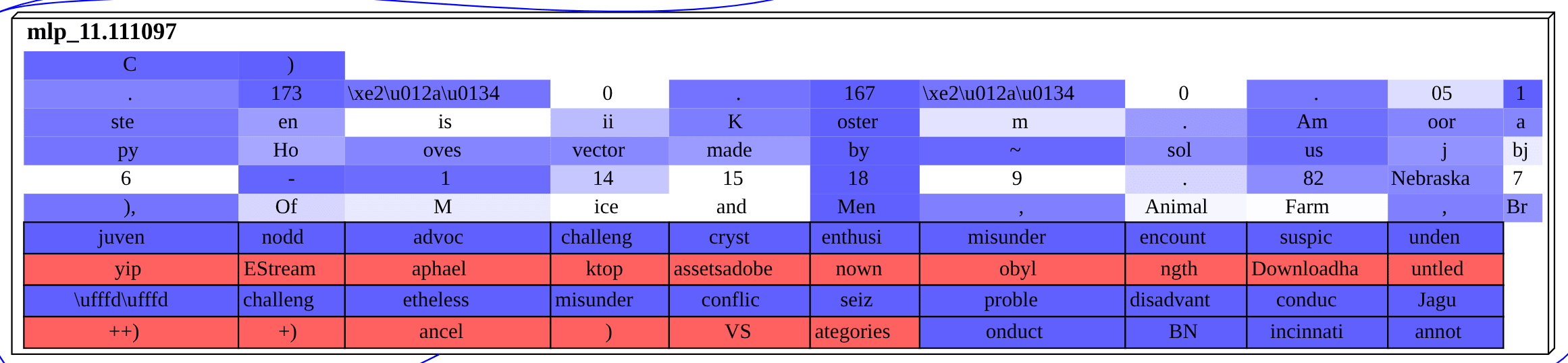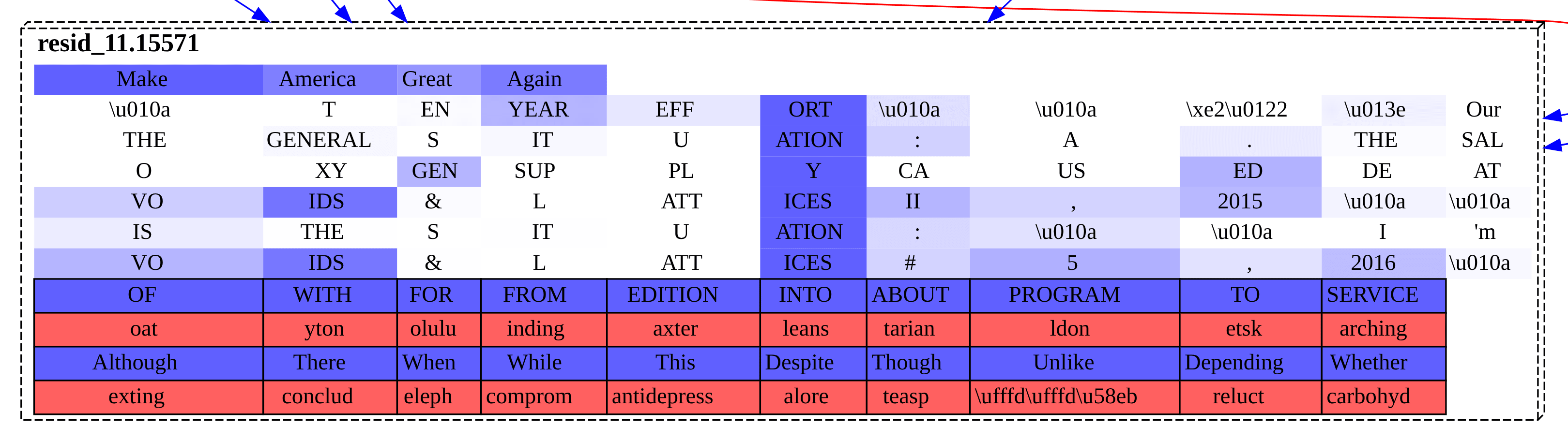 Below are the single top feature nodes for the token following each prompt. These nodes are then the main interpretable proximal cause for the model's logits, according to this sparse autoencoder circuit discovery framework. We are interpreting each node using its bottom-most blue row of boxes. That blue row represents the tokens that were most promoted by the feature in its forward pass. (Importantly, it is causal, not correlational, interpretability data.) Focus on that bottom-most blue row of logit boxes promoted.[2]