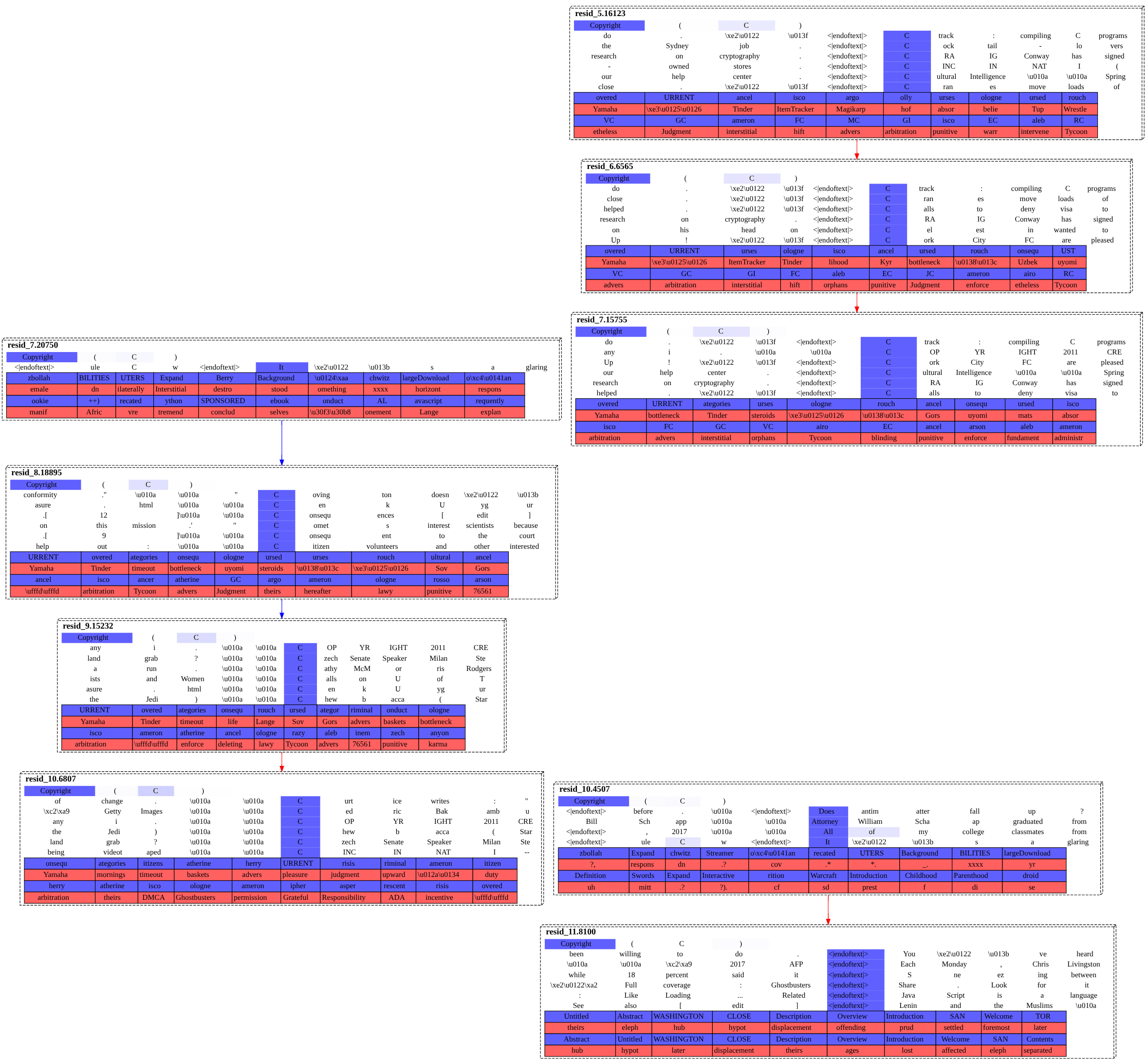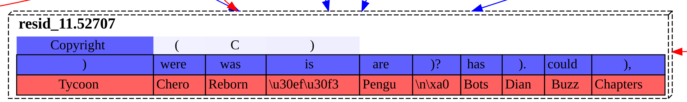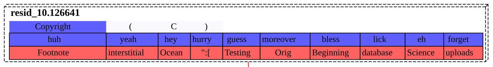 Well, last time, we saw persistent "causal threads" in GPT-2-small's residual stream over that forward pass. Certain sparse autoencoder features can be seen causally propagating themselves across a forward pass, just preserving their own meaning for later layers. The features that we observe doing this specifically look like hypotheses about what that model's next token will be. For example, for the Copyright (C