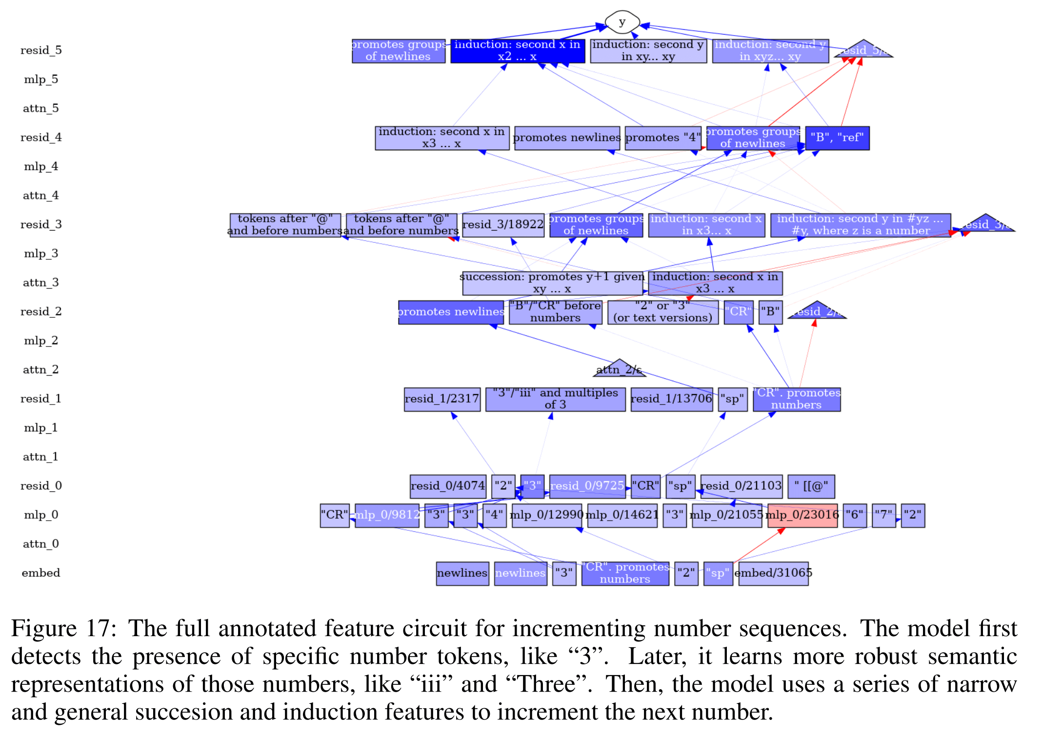 Relatively recently, Anthropic published work showing cross-layer transcoder circuit discovery that does work to that standard. They give the full cognitive algorithm that Claude is using for two-digit addition, e.g. Their result leads us to think that it is the "cross-layer-ness" of what they were doing that is really the special sauce there. If the autoencoder circuits we played with here are built out of local approximations to what the model is representing at various points in the forward pass, cross-layer transcoders are instead built out of global approximations. Our overall update is that the additional work of getting that global approximation is necessary to make circuits research work in naturalistic transformers.