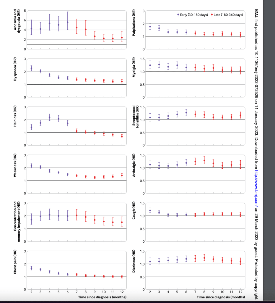 The general trend is “things get better”, with the rate of improvement varying by symptom type. Unfortunately cognitive effects are the slowest to resolve, with at best a 50% recovery rate one year out.