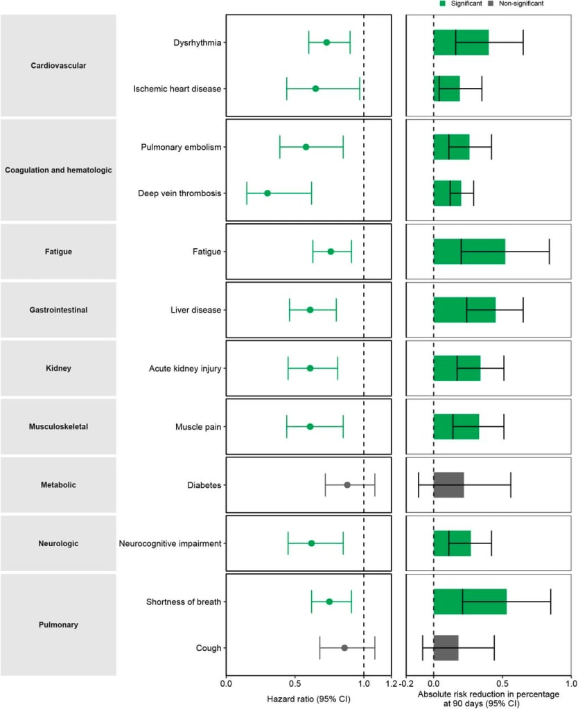 This study compared people who got covid and received Nirmatrelvir (half of Paxlovid). It used data from the American Department of Veteran Affairs, which means the participants are older (average age 65), overwhelmingly male (~90%), and very white (75%). Last time I checked maleness increases the risks of short-term covid consequences but decreases the risks of long term consequences, so good luck balancing that calculation.