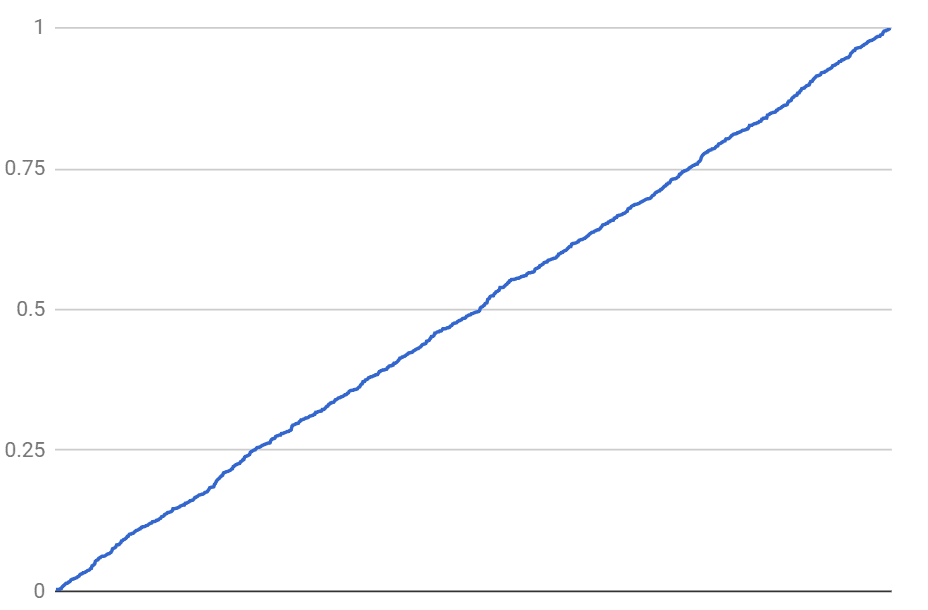 How do we find something like entropy in this toy model? After all, there aren't any macrostates we can average over some microstates. The lack of order is intentionally built into this universe from the beginning. All we have is a bunch of numbers. So, let us use the magnitude of each number as a poor-man's proxy for entropy, and assign the later time to larger numbers. In other words, let's sort the random sequence! Here is a sample sorted sequence: