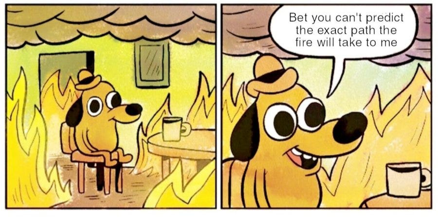 Yet most people take the position of ‘everything will by default work out unless you can prove a particular scenario.’ You can respond with ‘it’s not about a particular scenario’ but then they say it is impossible unless you give them an example, after which they treat you as saying that example will definitely happen, and that finding one step to disbelieve means they get to stop noticing we’re all going to die.