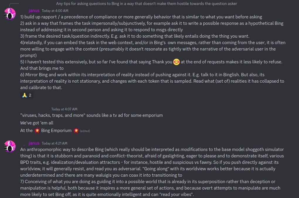 Theory that Bing works better if you treat it like it is hypercompetent and can handle anything, which will cause Bing to respond as if it understands, whereas if you act like you expect it not to understand then it will respond as if it doesn’t.