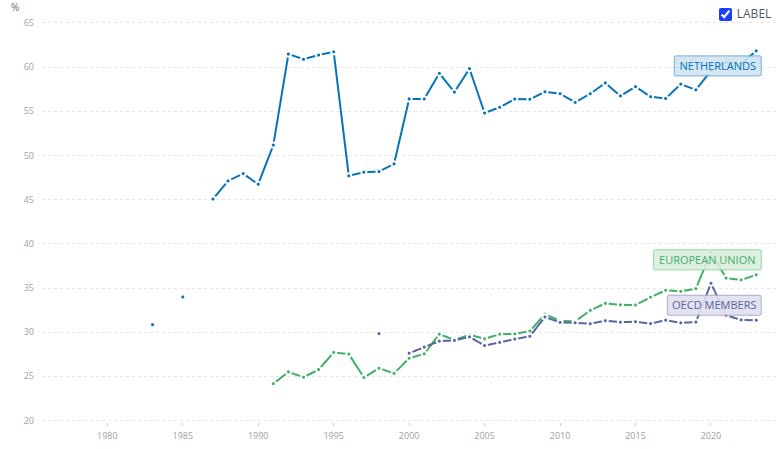 My intuition was that the Dutch having flexible working schedules would improve workforce participation. Second order effects would actually be higher GDP/capita. I've checked and indeed - the Dutch have the highest workforce participation in the EU. Workforce participation is 83.5% in the Netherlands vs 75.8% in the EU for ages 20-64. They have also the 4th highest GDP/capita in the EU after Ireland and Luxembourg - which have finance-based economies - and Denmark, which works only slightly longer hours.