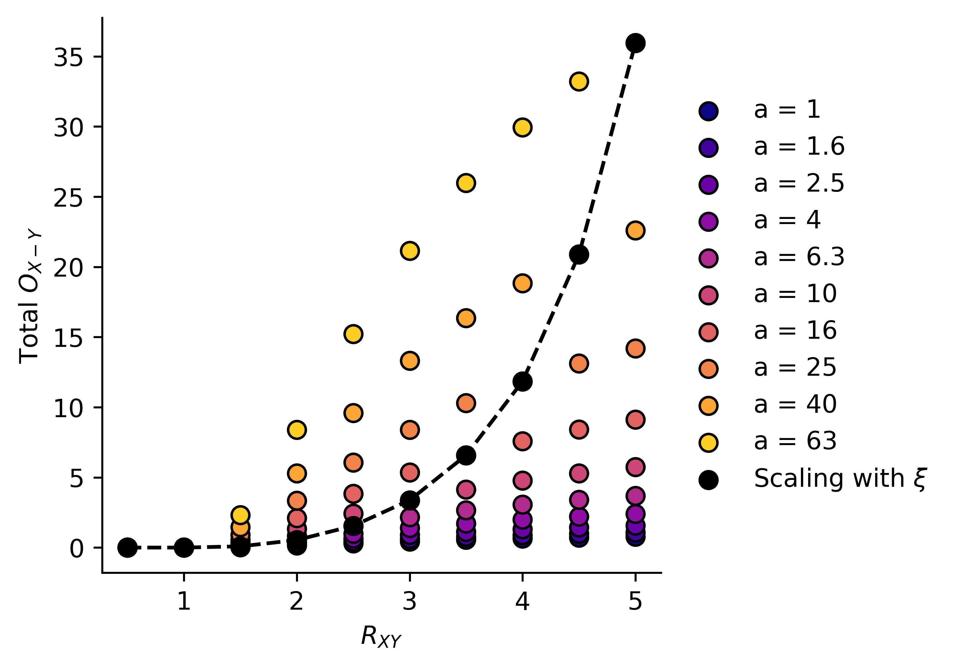 The question is, how do our parameters scale with AI "scale"? Let's assign AI scale the to variable (because xi is hard to draw and an AI's scale is hard to quantify) then we'll make the very conservative assumption that scales with , and scales with for some exponent , probably . This gives us a plot looking something like the black line below: