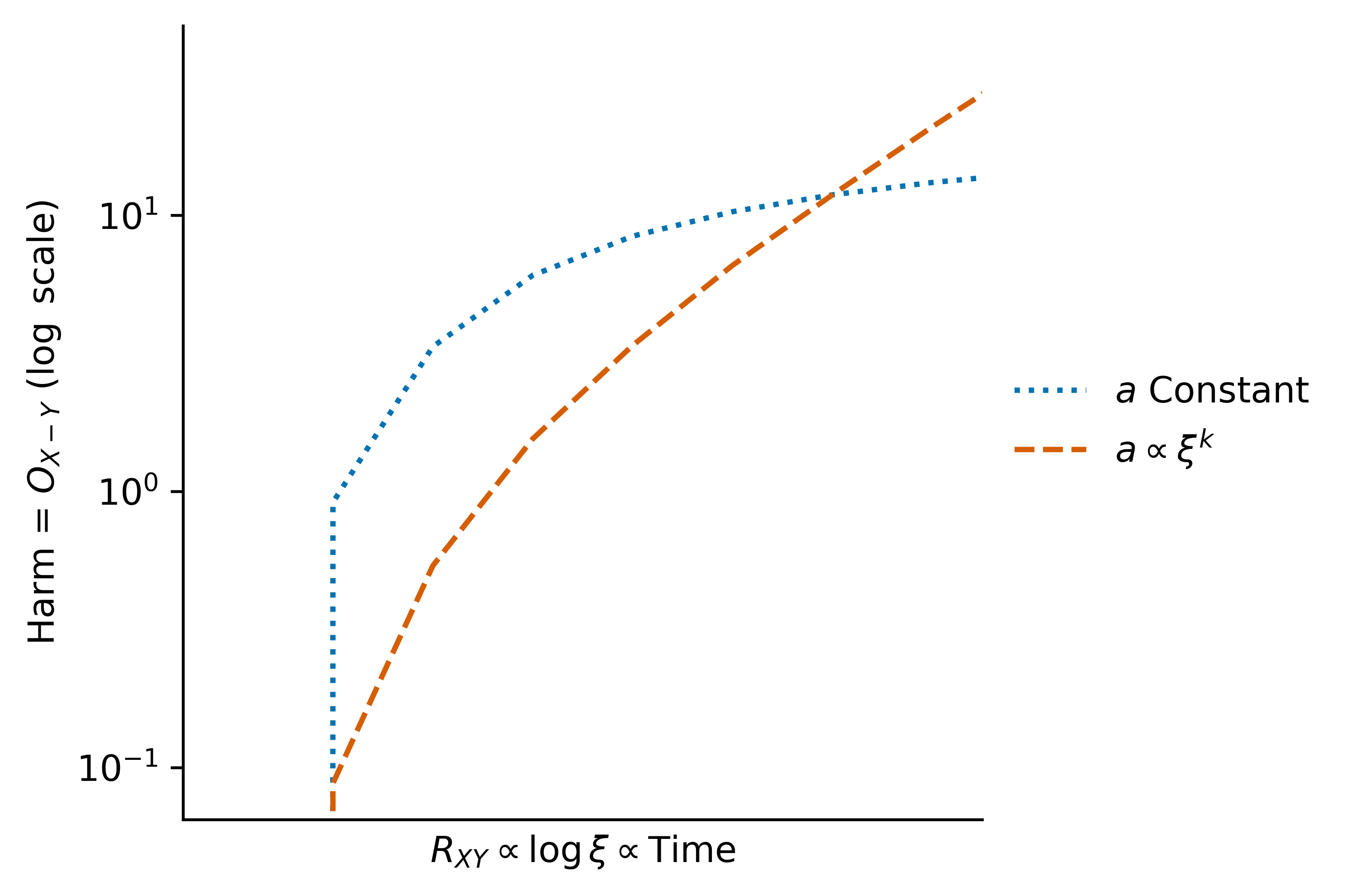 This model tells us to expect super-exponential scaling of AI harms around human level. It also tells us that the higher the dimensionality of the possible utility-function space, the more quickly these harms will grow.