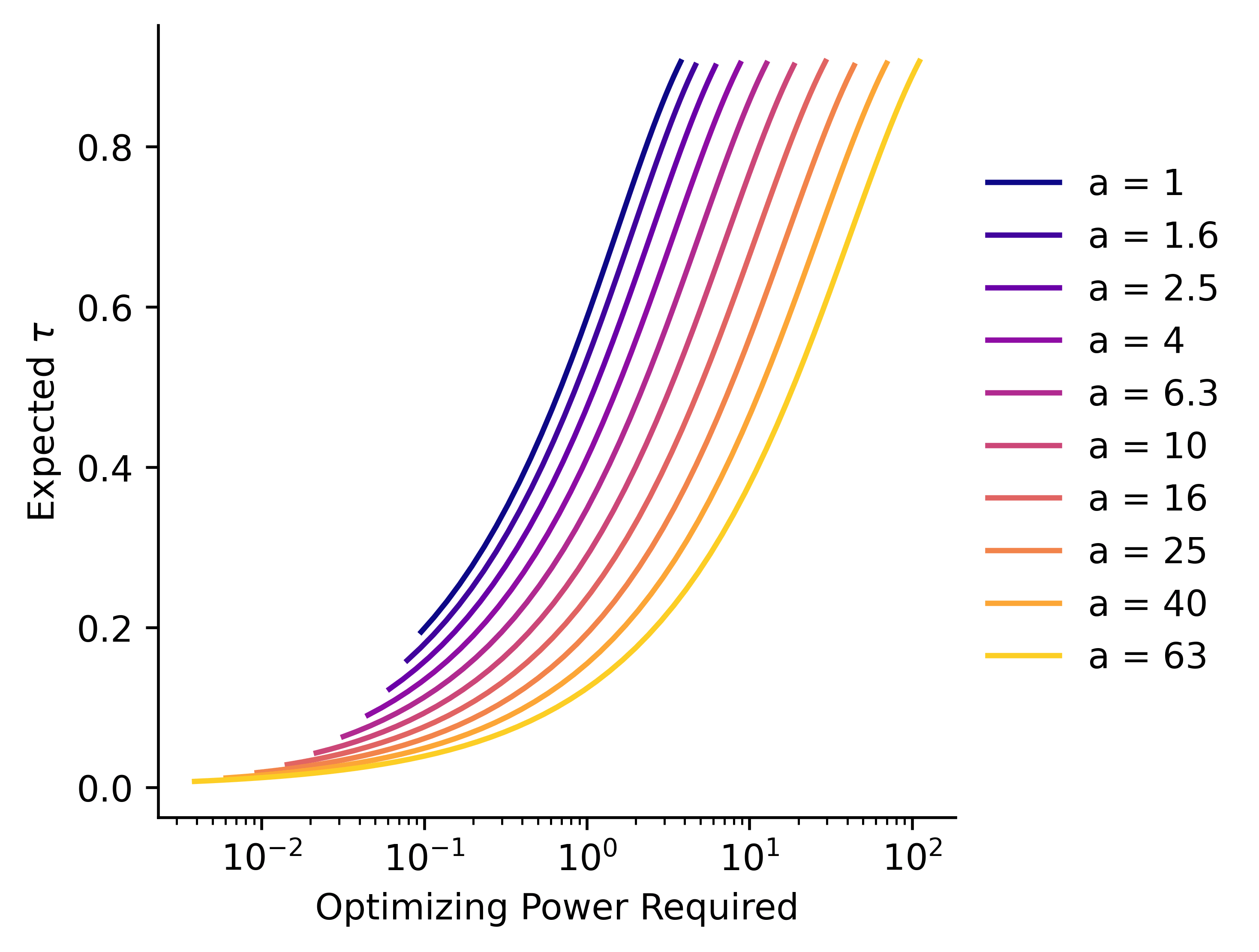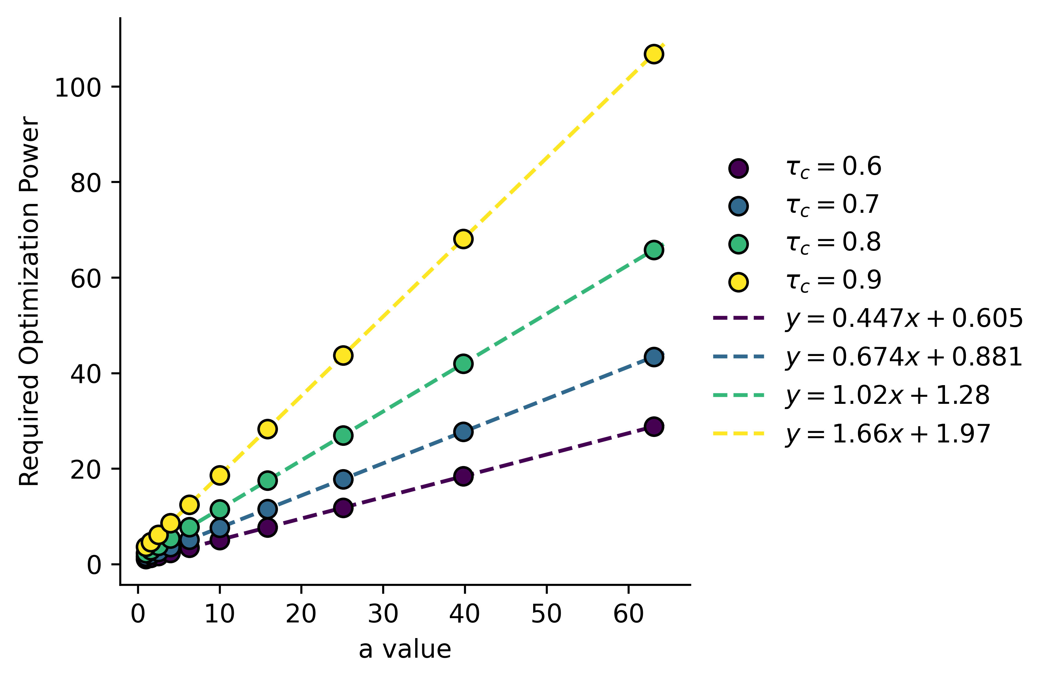 We can also see that this relationship is linear for any threshold we might want to set. This is somewhat unsurprising, the each dimension is just another, mostly independent, dimension along which we must optimize . The question is, how might we optimize the AI's utility function, and what are the constraints on ?