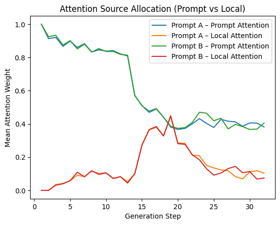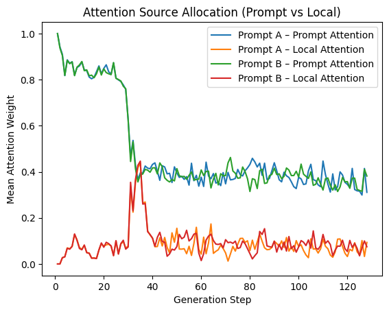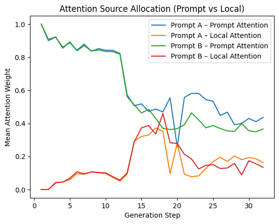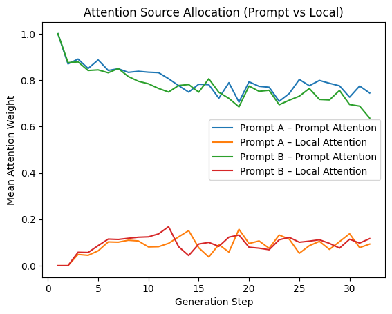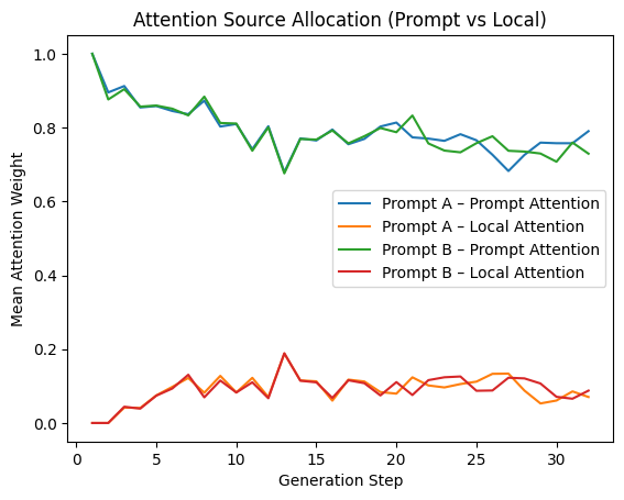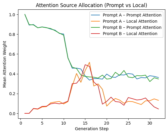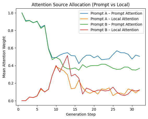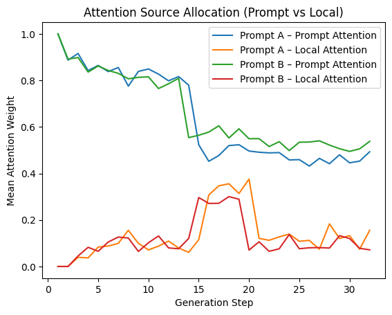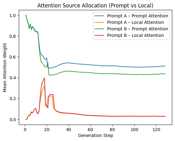 High Prompt Attention (>0.8) Prompt ↓, Local ↑ Prompt ≈ Local (~0.4) | Pure retrieval New info integration New equilibrium |
