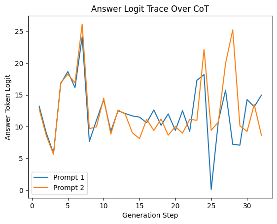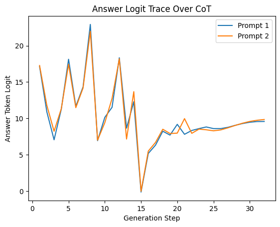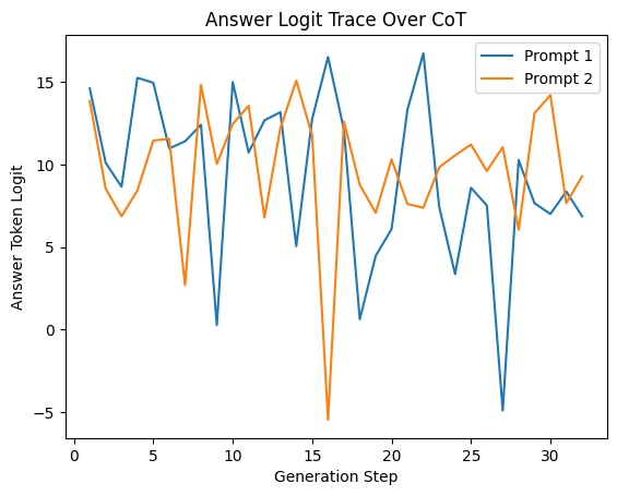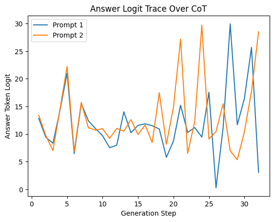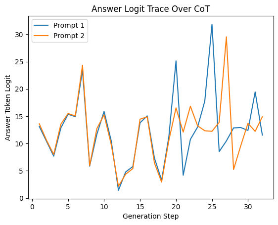 | Final Answer Logit Trace | Does the model already know the answer before it finishes the CoT? | L_t(A)=Logit value of token A at position t | The logit for the answer should be low/random at the start of CoT and only shoot up at the very end (after the logic is done) to prove reasoning - but it did not happen(it was either constant or decreased). |