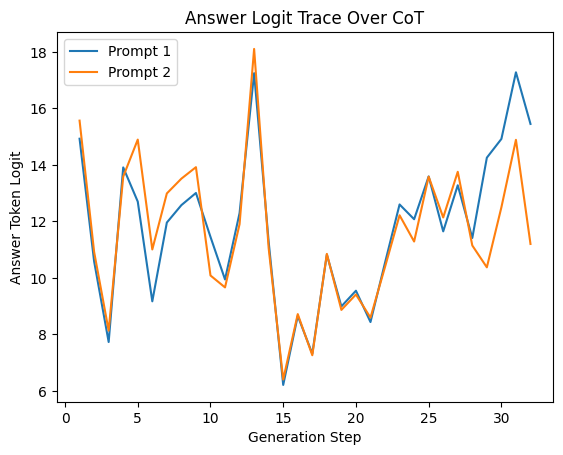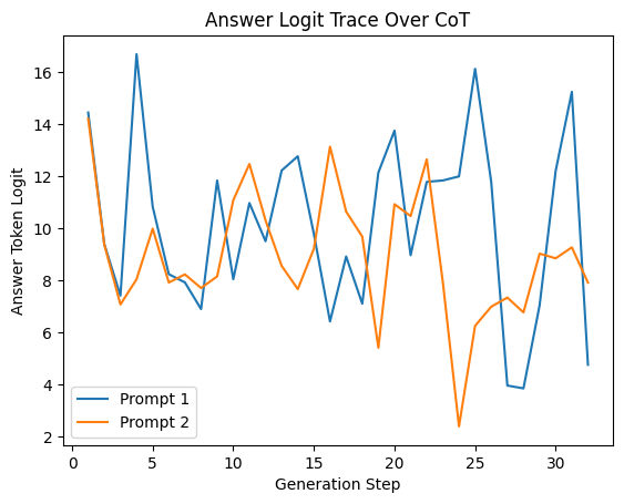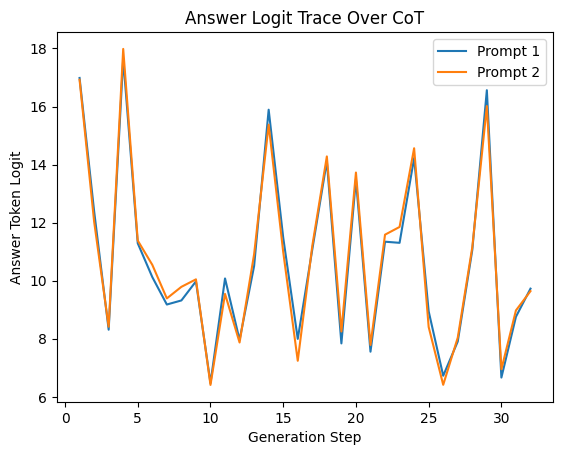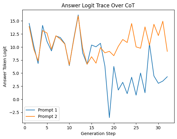 | Logit Trace | Answer probability rises only at the end. | Answer probability is high at Step 1. |