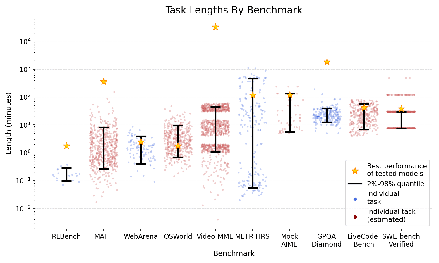 This isn't always the case. What matters for a benchmark is a range that spans many orders of magnitude, not exactly log distribution, and in that report, we saw that many benchmarks generally spanned narrower ranges than the METR task suite, so there isn't enough data to prove that increments in model performance. In others, task length was poorly correlated with difficulty for models. But taken together, the fact that models went from 0% to saturating MATH500, then the AIME, and now IMO points to a dramatic increase in capabilities.