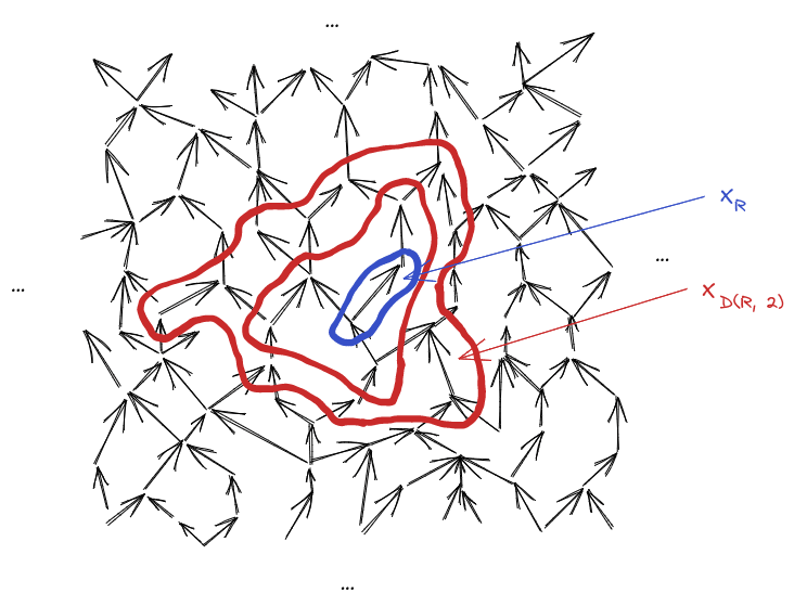 Within that graphical model, we’ll pick some tuple of variables (“R” for “region”)[2]. I’ll use the notation for the variables a distance away from , for variables a distance greater than away from , for variables a distance less than away from , etc.