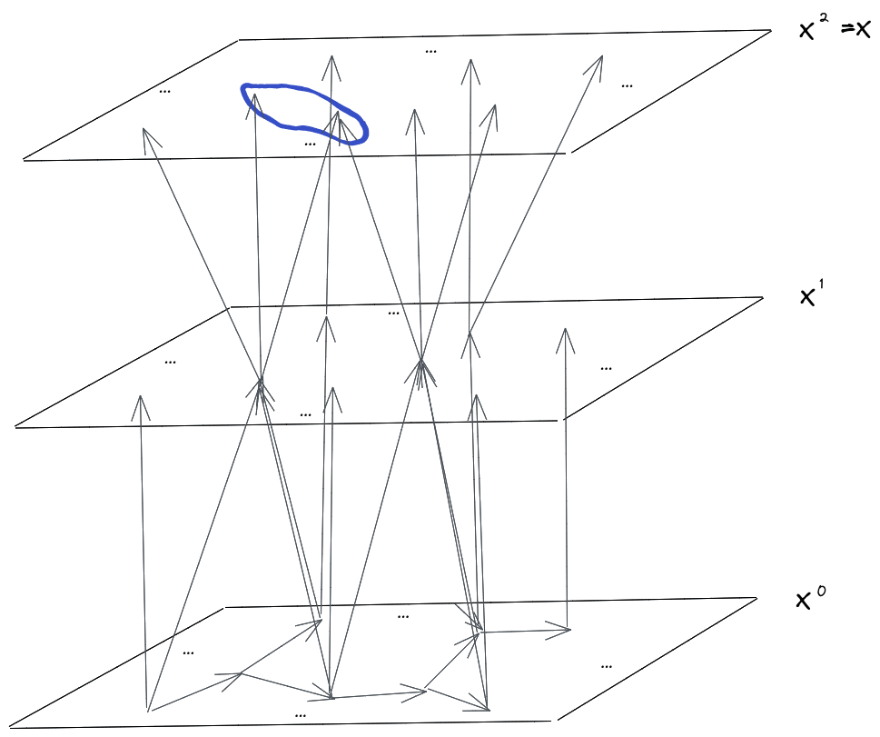Next, we’ll draw the Gibbs resampler as a graphical model. We’ll draw the full state at each timestep as a “layer”, with as the initial layer and as the final layer. At each timestep, some (nonadjacent) variables are resampled conditional on their neighbors, so we have arrows from the neighbor-variables in the previous timestep. The rest of the variables stay the same, so they each just have a single incoming variable from themselves at the previous timestep.
