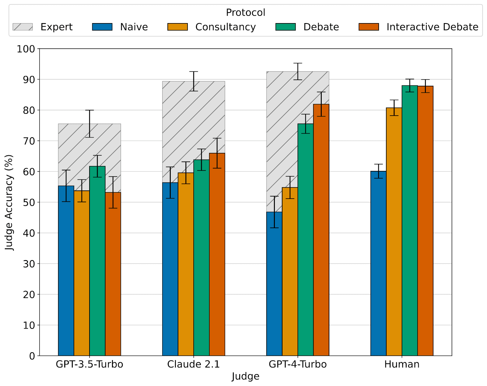 LLMs are poor at deliberation, so use at least GPT-4-Turbo capability for a judging model. Through our experience of protocol iteration, we often found confusing results after judging with GPT-3.5-Turbo and Claude, particularly with a smaller sample size. Weaker judges are more prone to being misled by trivial aspects of one side of an argument. GPT-4's superiority as a judge is evidenced by a larger area under the curve for debaters with a range of Elo ratings in the scatter plot showing the different judges above.
