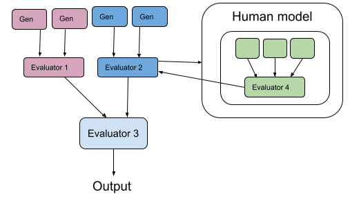 Suppose that an AI is trying to choose an action. One way to do this is to generate a number of potential actions internally, using some kind of heuristic process, then pass forward one of them based on some criterion. The process which creates candidates (say from a random seed) can be termed the “generator”, and the process which selects a candidate to send forward can be termed the “evaluator” (denoted “eval()”).