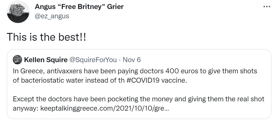 But maybe this is actually… not the best? And we shouldn’t be happy about people getting vaccinated while the doctor tells them they’re getting water, regardless of the bribery and the attempted fraud, because the one does not make the other okay?