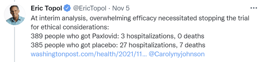 I was considering splitting off my analysis of the effectiveness of Pfizer’s Paxlovid, a new Covid-19 treatment pill, but it’s so straightforward there’s no reason to do that. It works, with our best guess being it is 89% effective at preventing hospitalization and death, and that’s that. Trial was halted because medical ‘ethics’ is crazy and decided we couldn’t study the pill because it was too effective. Paxlovid still needs to be approved and production needs to be scaled up, but both of these seem like near certainties.