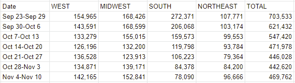 The miss on deaths is due to a large increase in the West. On reflection I likely should have baked some of that in, -11% was a lousy prediction and -7% or so would have been a better prediction. I do think that this is still a disappointing number despite that. For cases the miss is the same size, but this seems more like uncertainty rather than mostly being a mistake in prediction. Cases rising this much this quickly was definitely surprising, and a large update on what’s likely to happen this winter.
