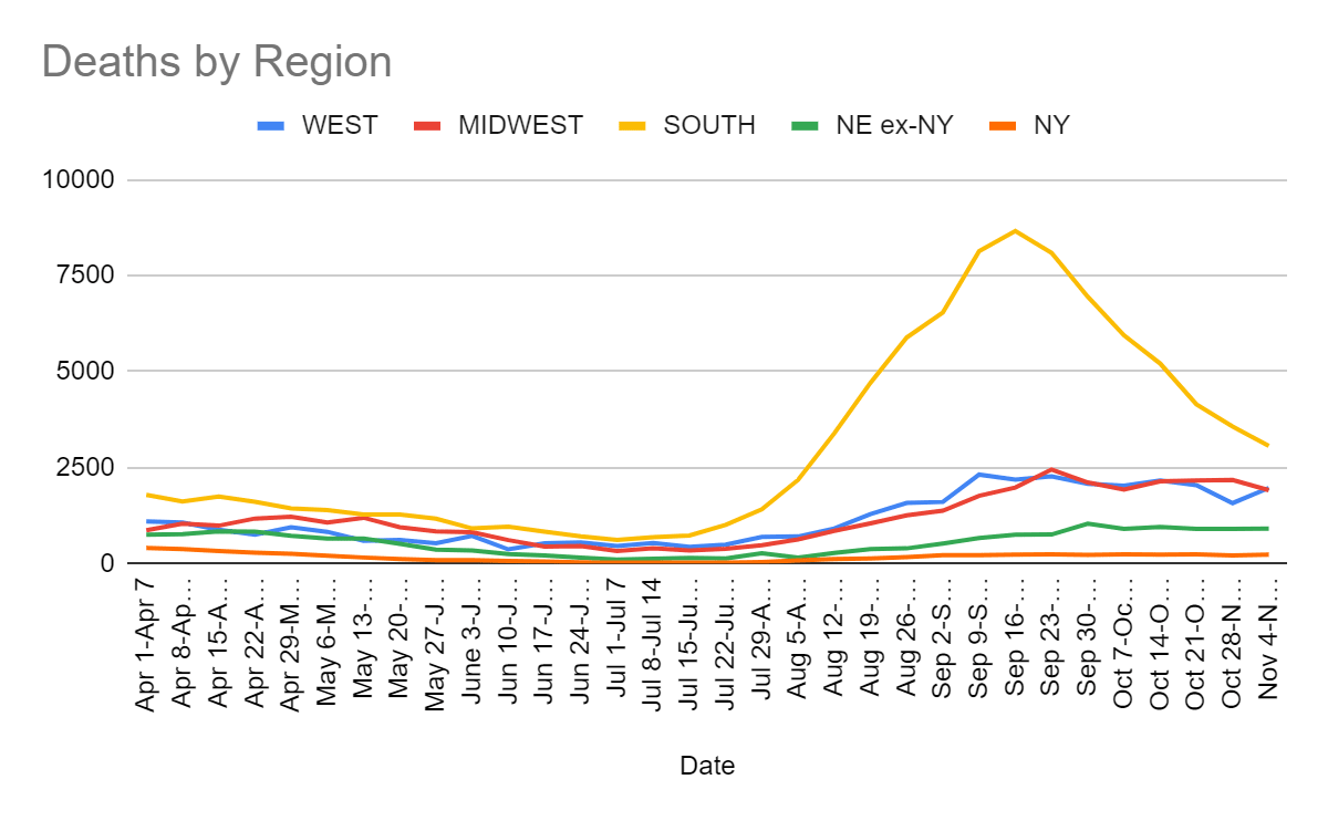 The jump in the West is not centered on one particular state, with several reporting the highest levels in a while. I’d like to say it is a systematic reporting pattern somehow, and I presume that some deaths from last week out West got shifted into this week. I don’t have any gears for that explanation and given it’s not focused in one state I don’t feel great about not having any gears to explain it. Still, it seems a lot more likely than this being a real decline followed by a real increase.